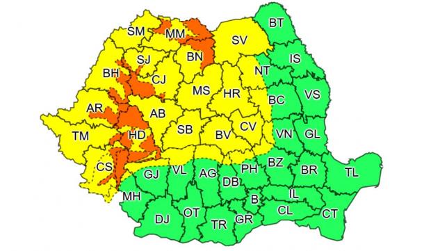 VREMEA. ”În zona de munte a județelor Cluj, Sălaj, Bihor, Arad, Timiș, Hunedoara, Maramureș, Bistrița-Năsăud și Caraș Severin vor fi precipitații abundente și se vor acumula local 40...50 l/mp.” prevede alerta de Cod Portocaliu.