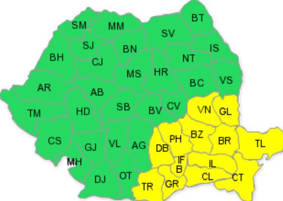 Duminică seară, la ora 21, intră în vigoare un cod galben de vânt care va afecta sudul şi estul ţãrii, îndeosebi în Muntenia (inclusiv în zona municipiului Bucureşti), în sudul Moldovei şi în Dobrogea unde rafalele vor depãşi 55...65 km/h.