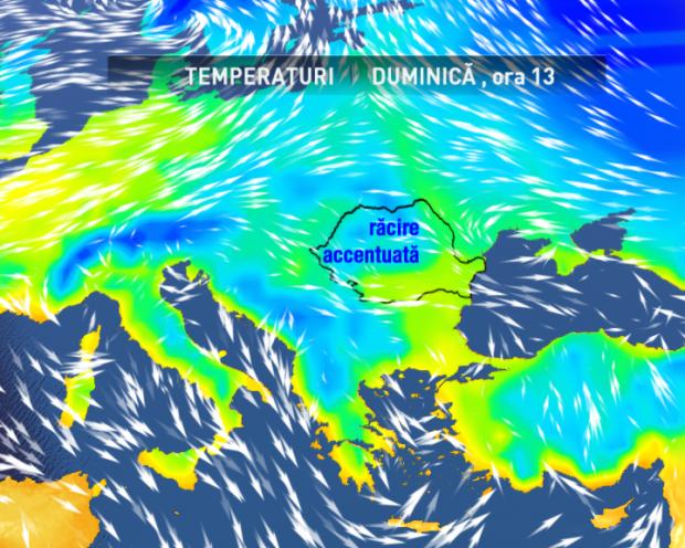 Vremea se va răci faţă de intervalul precedent, astfel încât temperatura maximă va fi de 11...12 grade, iar cea minimă se va situa în jurul valorii de 7 grade. Cerul va fi noros şi temporar va ploua. Vântul va sufla în general moderat.