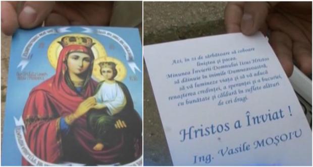 Pliantele care aveau pe o parte imaginea Fecioarei Maria şi pe partea cealaltă mesajul candidatului penal pentru funcţia de edil al comunei au fost împărţite credincioşilor chiar de preotul care oficia slujba, Pantelimon Birceanu.