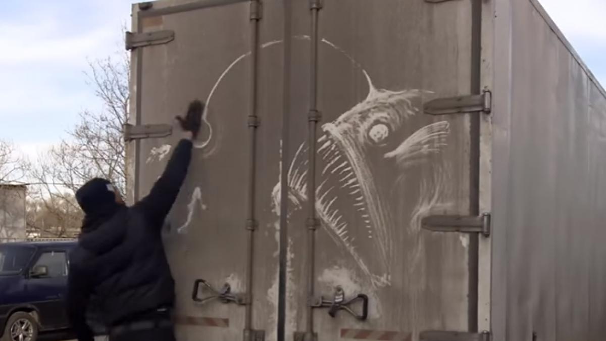 Rusul Nikita Golubev crează adevărate opera de artă pe camioanele și camionetele murdare, potrivit Daily Mail.