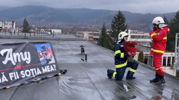Un pompier și-a așteptat iubita pe o clădire la 10 metri cu un buchet de flori. Când tânăra reprezentantă a ISU Argeș a fost urcată cu o platformă, pompierul a îngenunchiat în faţa iubitei sale şi a întrebat-o dacă vrea să îi fie soție.