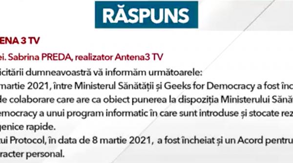 Pe vremea când Vlad Voiculescu era la Ministerul Sănătății, acesta a făcut un protocol cu acest ONG - Geeks for Democracy - să realizeze o aplicație și toate datele persoanelor care se testează să fie băgate, prin acea aplicație, într-o bază de date.