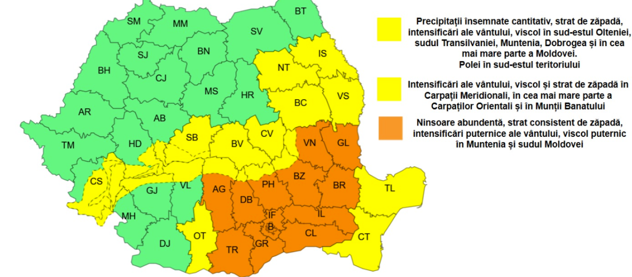 ANM a emis și un cod galben de precipitații însemnate cantitativ, strat de zăpadă, intensificări ale vântului, viscol, polei, valabil până la aceeași oră, miercuri.