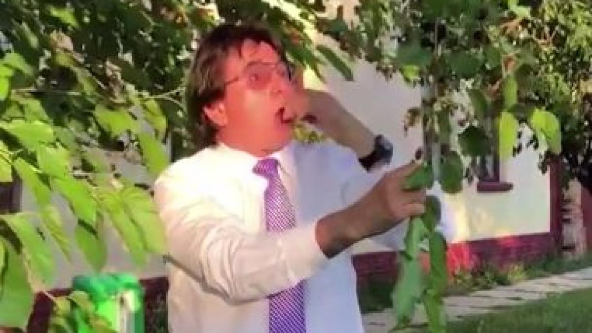 Pentru Nicolae Robu nu a contat că este primarul unuia dintre cele mai mari oraşe din ţară sau că fructele sunt nespălate. Le-a rupt de pe crengile încărcate şi le-a mâncat. A fost însă atent să nu-şi murdărească costumul de firmă.