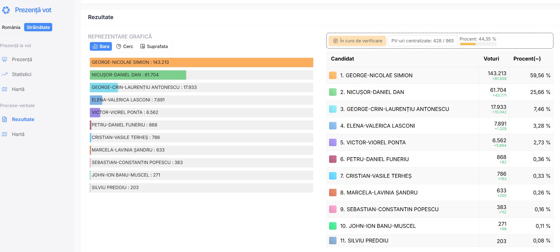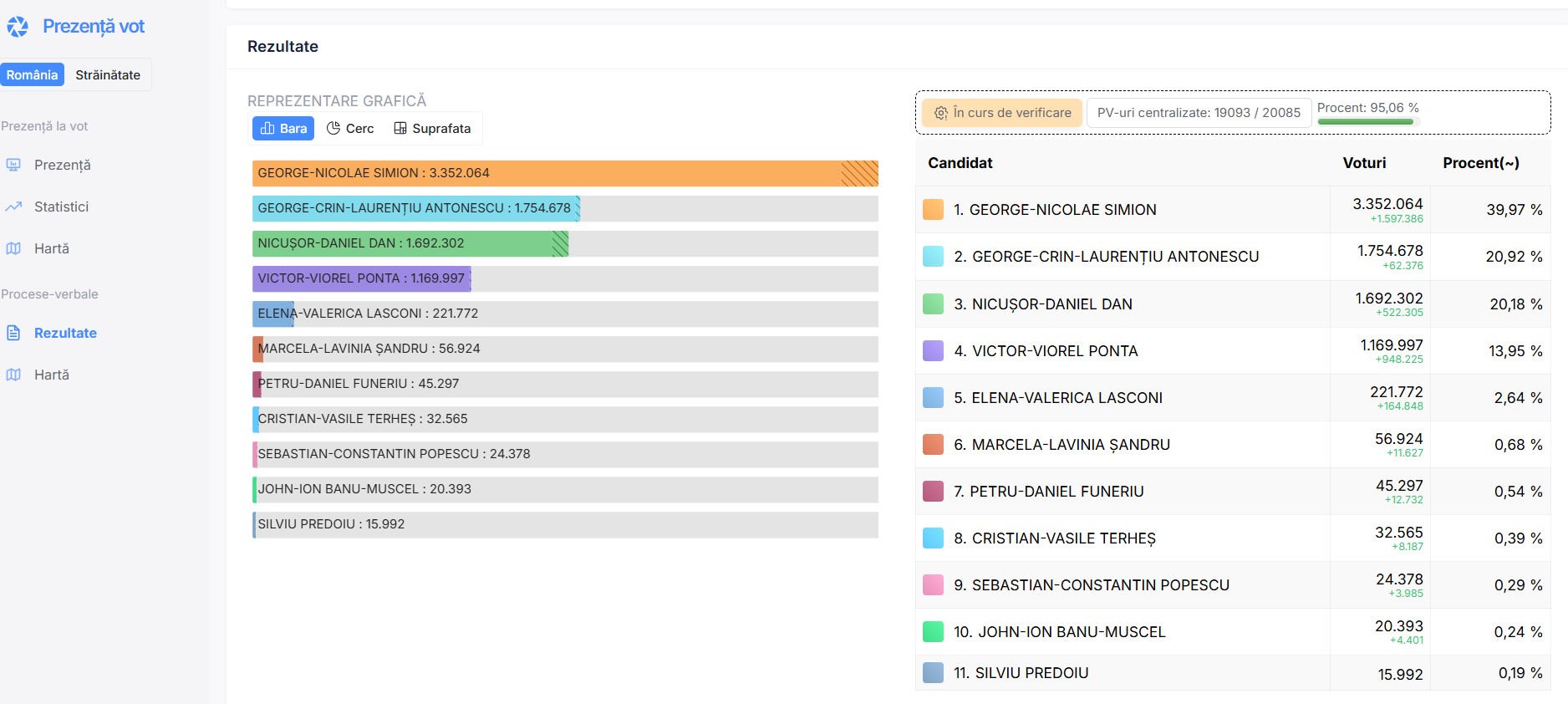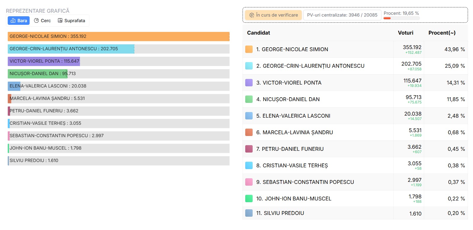 George Simion este pe primul loc, cu 57,95% din voturi, urmat de Nicușor Dan, cu 26,29% și Crin Antonescu - 8,17%.