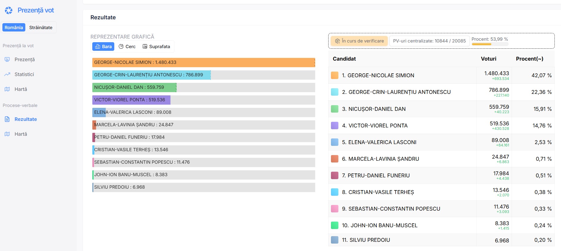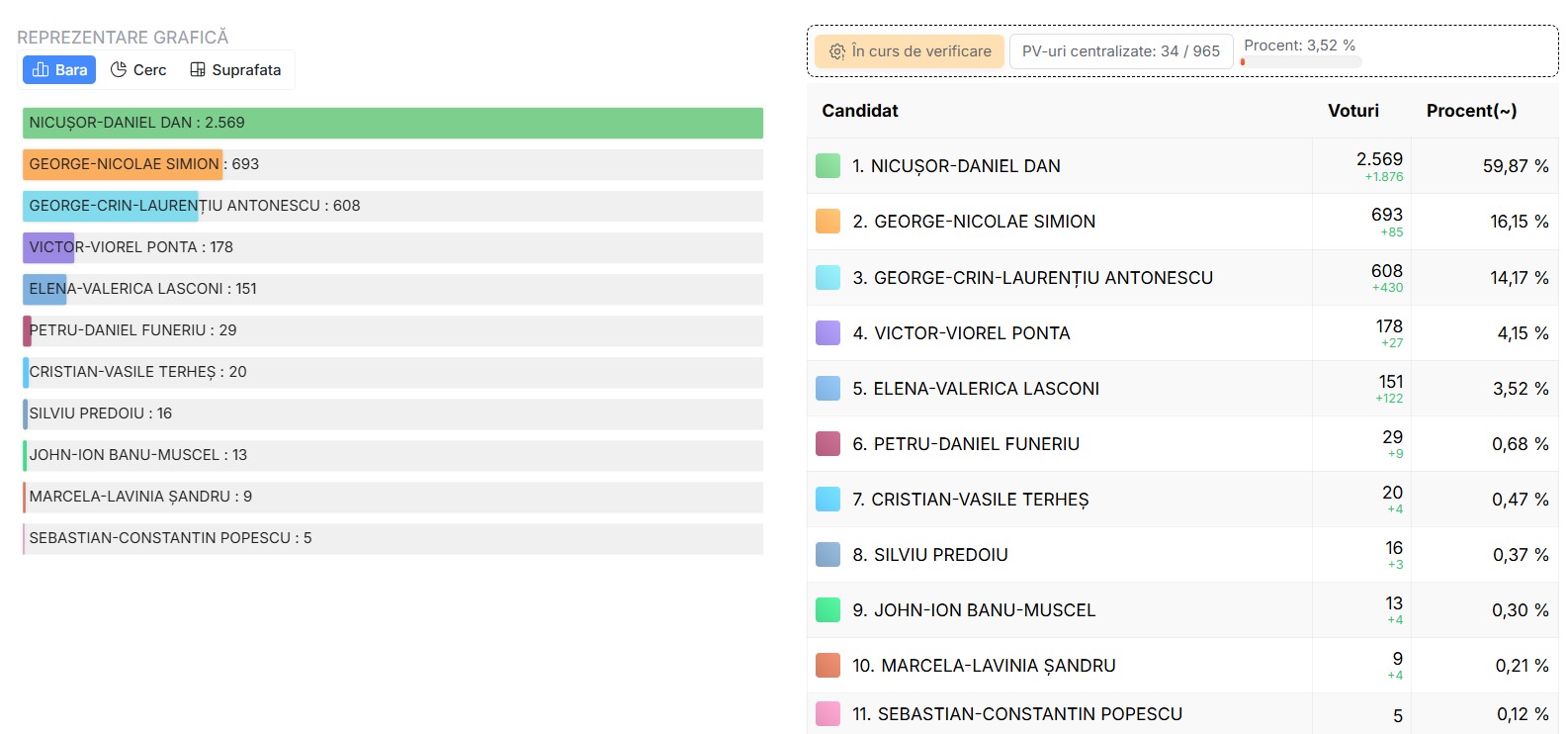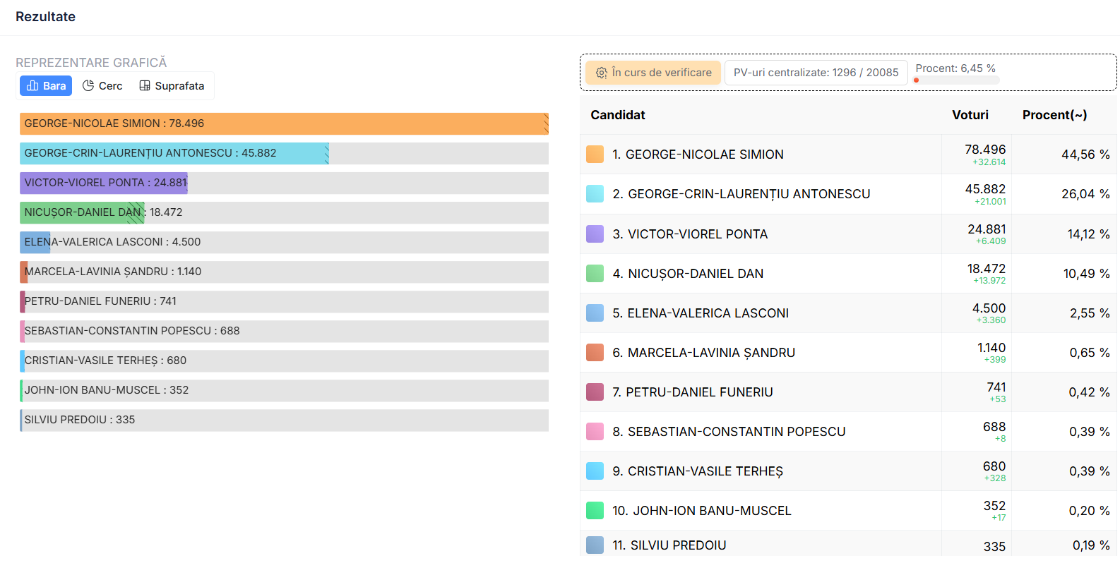 George Simion este pe primul loc, cu 57,95% din voturi, urmat de Nicușor Dan, cu 26,29% și Crin Antonescu - 8,17%.