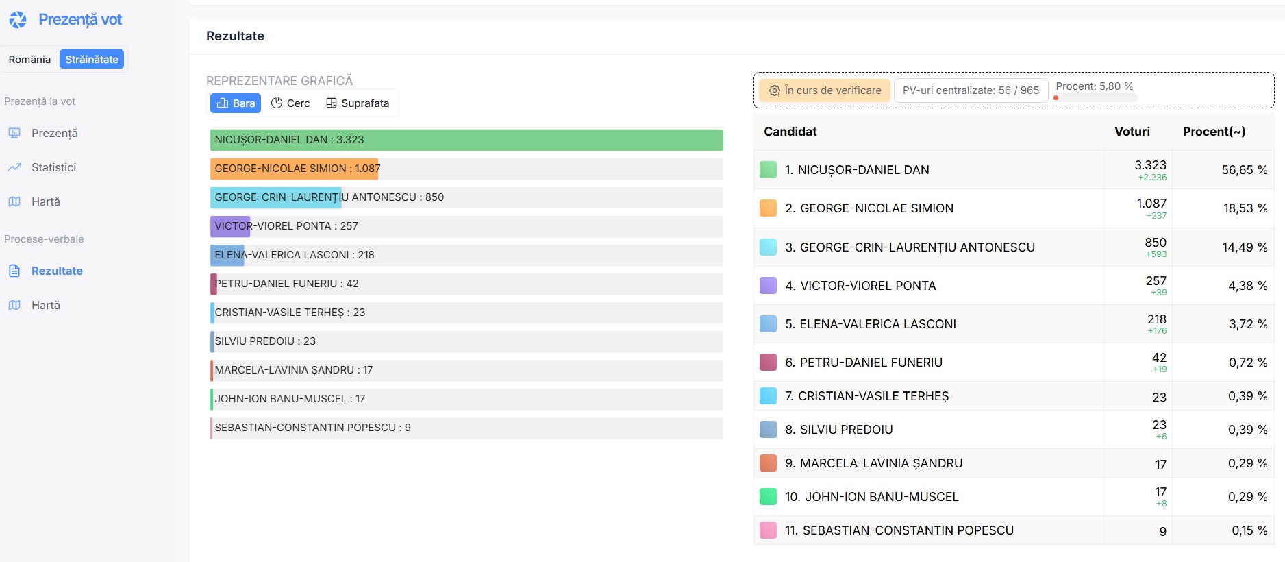 După centralizarea a 6% a proceselor verbale din diapora, Nicușor Dan are un avans mult mai mare față de următorul clasat - George Simion. Primarul general al Capitalei are 54% din voturi.