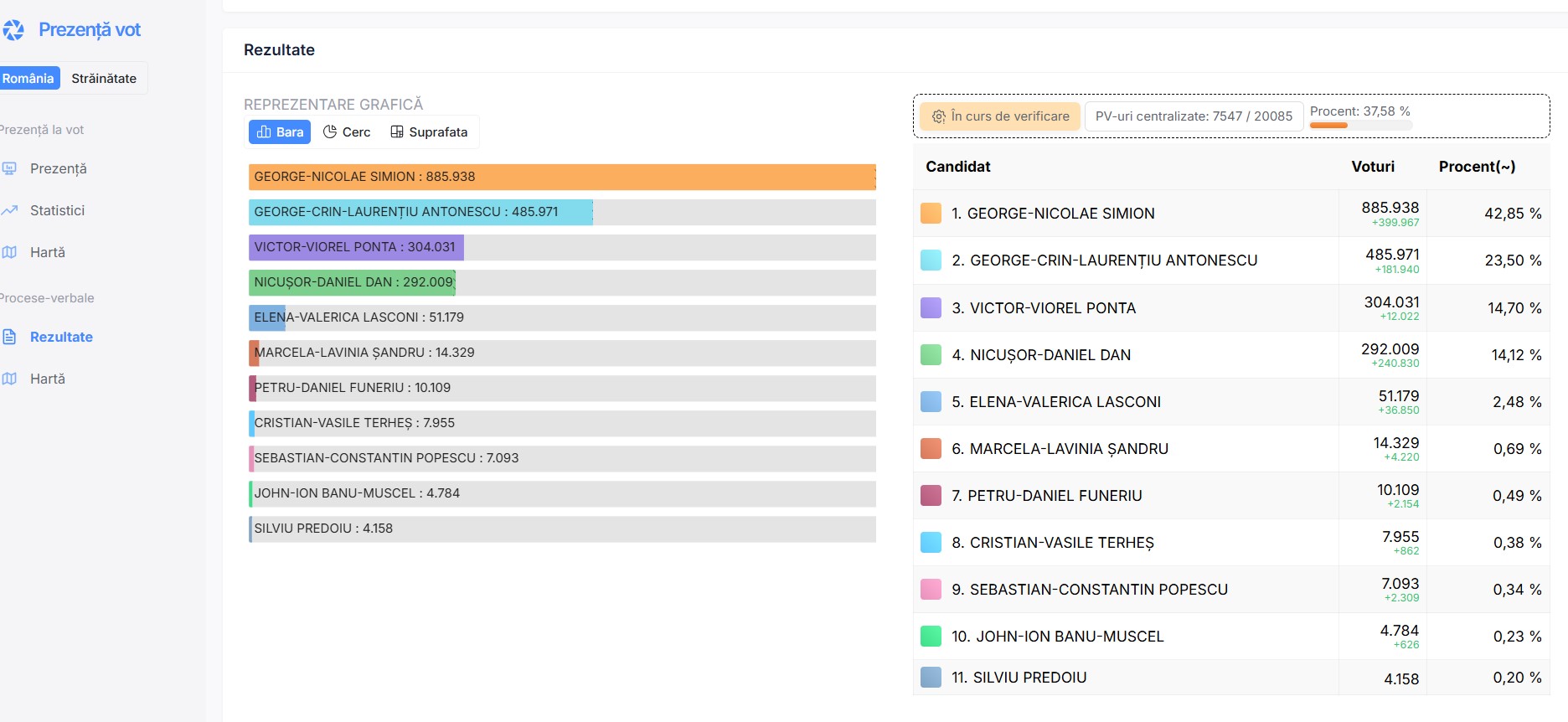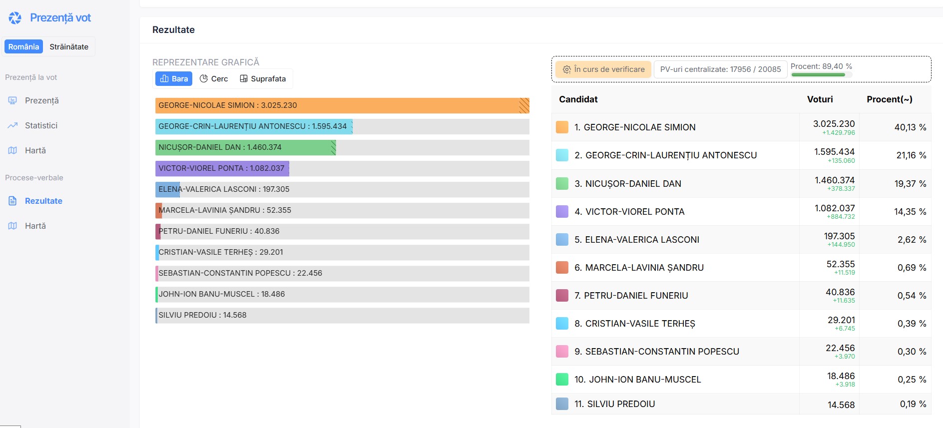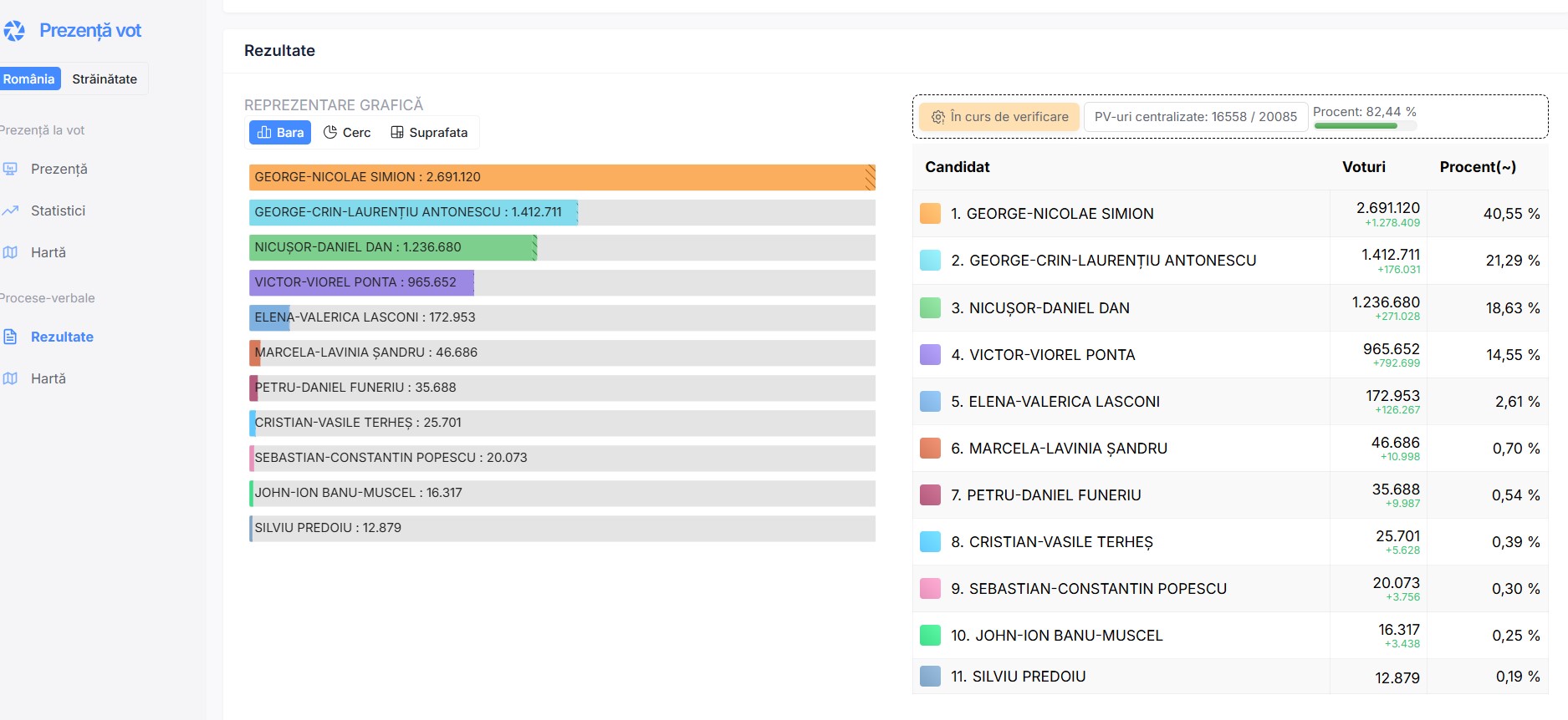 Rezultate parțiale: Simion obține peste 3,7 milioane de voturi, Nicușor Dan are cu aproape 100.000 mai mult decât Antonescu