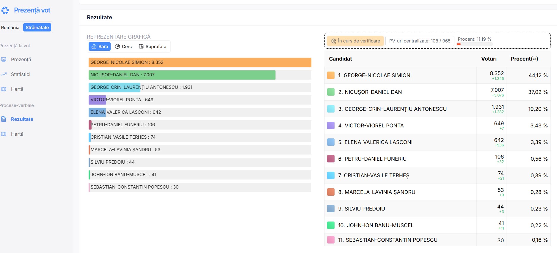 După centralizarea a 11% din procesele verbale din diapora, clasamentul s-a modificat, George Simion trecând pe primu loc, cu 44% din voturi. Este urmat de Nicușor Dan, cu 37% din voturi.