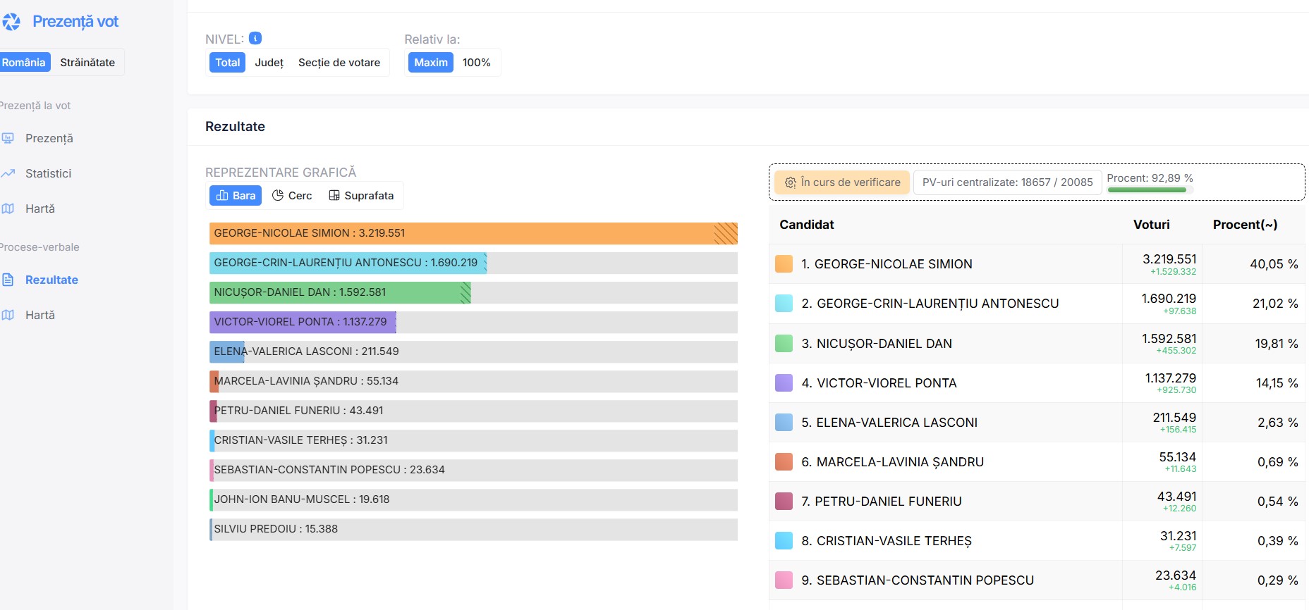George Simion a obținut 3.751.536, adică 40,59%, în timp ce Nicușor Dan are 1.935.980 - 20,95%.