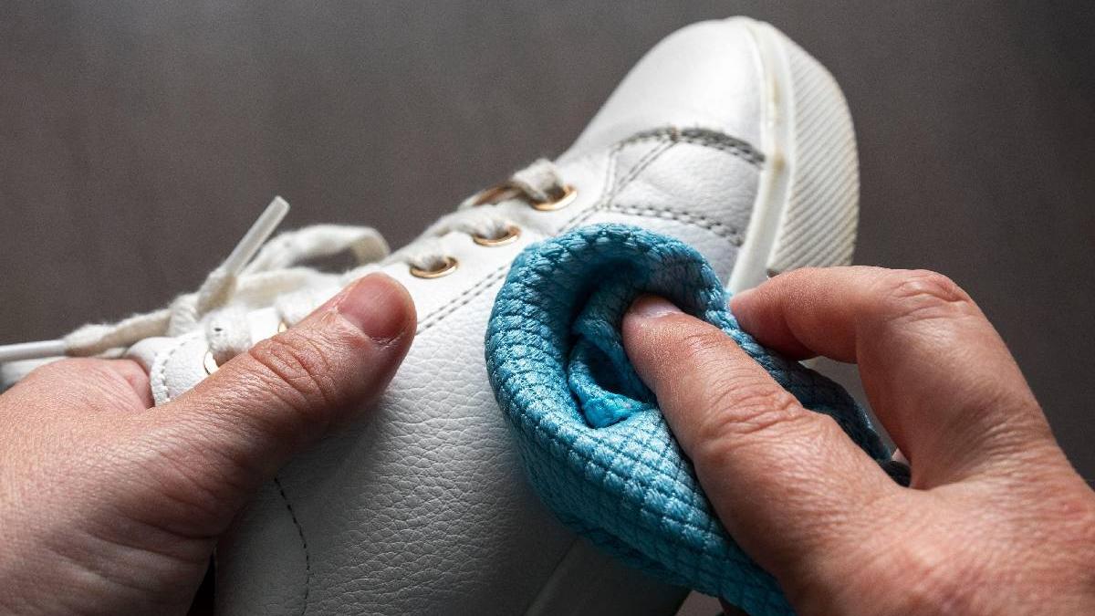 Se șterg bine adidașii cu o cârpă înmuiată în apă călduță. Este nevoie să se repete acest pas, astfel încât să nu rămână urme de soluție, care s-ar putea transforma, în timp, în pete.