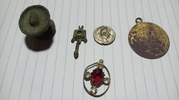 O monedă, cel mai probabil, din aur și un pandantiv cu pietre, se aflau îngropate la o adâncime mică, de aproximativ 25 de cm. La mică distanță de ele, a mai descoperit o moneda romană de argint, un cercel medieval și o piesa necunoscută, confecționată din bronz.
