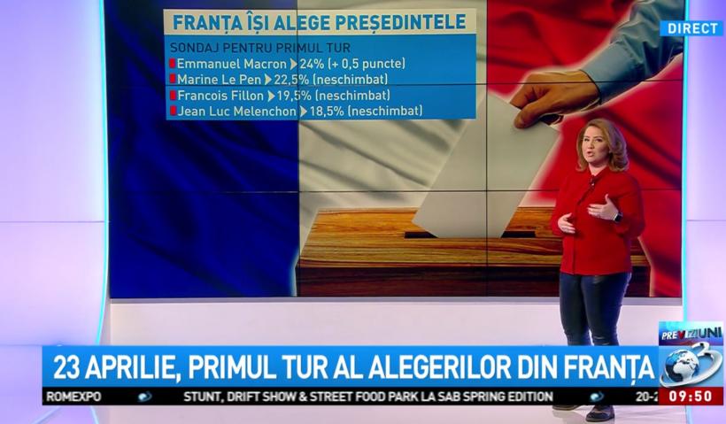 Cel mai recent sondaj arată că Emmanuel Macron are 24% șanse în acest moment să câștige. Acesta a înregistrat o creștere de 0,5 % față de precedentul sondaj. Marine Le Pen 22,5%, procent neschimbat, iar în ceea ce îi privește pe Francoi Fillon (19,5%) și Jean Luc Melenchon (18,5), procentele rămîn neschimbate și în cazul lor.