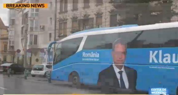 Unul dintre autocarele branduite cu numele lui Klaus Iohannis a fost suprins de jurnaliştii pressalert.ro la Timişoara, chiar în apropierea locului unde urmează să aibă loc mitingul.