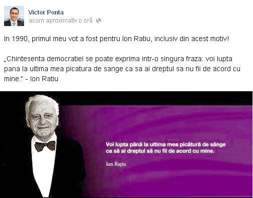 "În 1990, primul meu vot a fost pentru Ion Raţiu, inclusiv din acest motiv! <Chintesenţa democraţiei se poate exprima într-o singură frază: voi lupta până la ultima mea picătură de sânge ca să ai dreptul să nu fii de acord cu mine>—Ion Raţiu", scrie, joi, pe contul de Facebook al premierului.