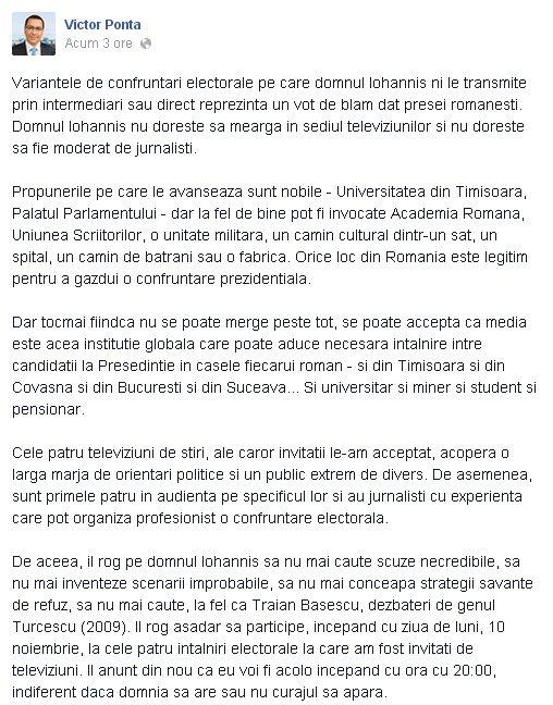 "Cele patru televiziuni de ştiri, ale căror invitaţii le-am acceptat, acoperă o largă marjă de orientări politice şi un public extrem de divers", mai scrie Victor Ponta, pe Facebook.