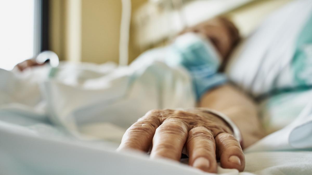 femeie batrana cu masca de oxigen pe fata intr-un pat de spital