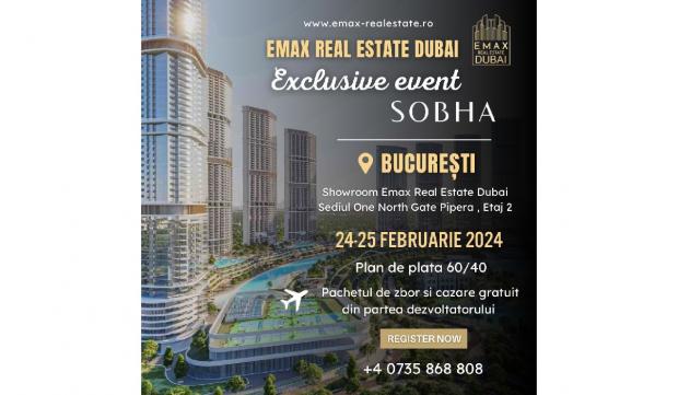 Emax Real Estate Dubai te așteaptă la showroom-ul din București, în data de 24 și 25 februarie, cu cele mai mari discounturi promoționale ale dezvoltatorului SOBHA!
