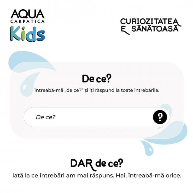 AQUA Carpatica Kids încurajează curiozitatea neîngrădită a copiiilor. Campania ,,De ce?’’ își propune să răspundă la orice întrebare pe care micuții o pot ridica. Cu ajutorul Kids Chat, o platformă interactivă bazată pe un sistem de inteligență artificială special configurat, cei mici pot primi răspunsuri într-un limbaj adaptat vârstei lor.