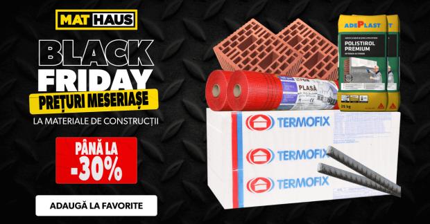 · Materiale de construcții pentru interior și exterior - dacă ai în plan o construcție sau doar o renovare, Black Friday este momentul potrivit să investești în materiale de calitate la prețuri reduse. La MatHaus gasesti prețuri reduse la: caramida, termoizolatie, oțel beton, materiale prafoase și OSB.