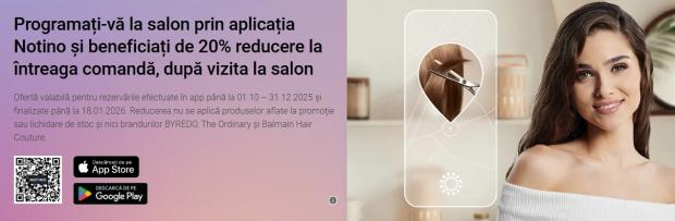 Totul se gestionează digital, fără telefoane sau așteptare la recepție. Programările făcute prin aplicație între 1 octombrie și 31 decembrie 2025, cu vizită finalizată până pe 18 ianuarie 2026, aduc automat 20% reducere la următoarea comandă plasată pe Notino (exclus produse deja la promoție, lichidare de stoc, BYREDO, The Ordinary și Balmain Hair Couture).