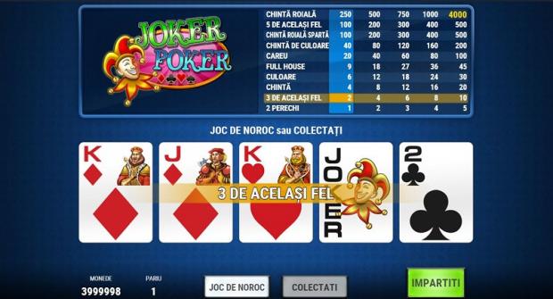 Joker Poker este un tip de video poker cu simbol Wild, reprezentat de un joker. Astfel, spre deosebire de varianta clasică Jacks or Better, pe care ți-o recomandăm dacă ești începător, mai apar două combinații câștigătoare: „chintă roială spartă” (chintă roială formată cu ajutorul jokerului) și „5 de-un fel” (un careu plus un joker).