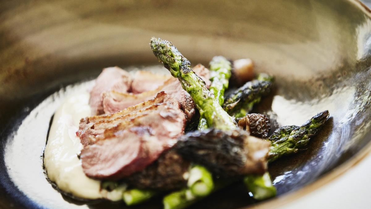 Farfurie cu piept de rață cu sparanghel și vin roșu. FOTO: Getty Images.com