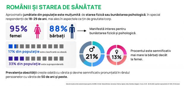17% din populaţia țării noastre este clasificată ca obeză, iar 33% este supraponderală. Sunt procentaje mult mai scăzute în comparație cu celelalte șapte țări europene în care s-a desfășurat cercetarea (Germania, Polonia, Spania, Italia, Bulgaria, Turcia, Regatul Unit). Prin urmare, românii sunt mai preocupați de arii precum capacitatea de odihnă (89%), de a face față stresului (88%), calitatea și durata somnului (88%), imunitatea organismului (89%), vitalitatea/energia (87%), capacitatea de concentrare (87%) și alimentația sănătoasă (87%).