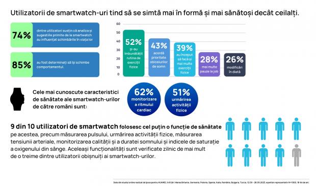 Potrivit studiului HUAWEI, 95% dintre români (cel mai mare procent la nivelul țărilor studiate) vor să-și îmbunătățească cel puțin un aspect din stilul lor de viață. 9 din 10 utilizatori de smartwatch folosesc cel puțin o funcție de sănătate pe acestea, precum măsurarea pulsului, urmărirea activității fizice, măsurarea tensiunii arteriale, monitorizarea calității și a duratei somnului și indicele de saturație a oxigenului din sânge. Aceleași funcționalități sunt verificate zilnic de aproximativ 50% dintre utilizatorii obișnuiți ai ceasurilor inteligente. Cele mai cunoscute caracteristici de sănătate ale smartwatch-urilor de către români sunt monitorizarea ritmului cardiac (62%) și urmărirea activității fizice (51%).