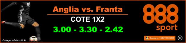 Franța e ușor favorită la calificare cu cota 1.73, iar englezii au 2.10. Pentru cotele 1X2, francezii au 2.40 să câștige, englezii au 3.05, iar egalul are 3.20. Selecția Peste 2.5 goluri are cota 2.00, iar Sub 1.72.