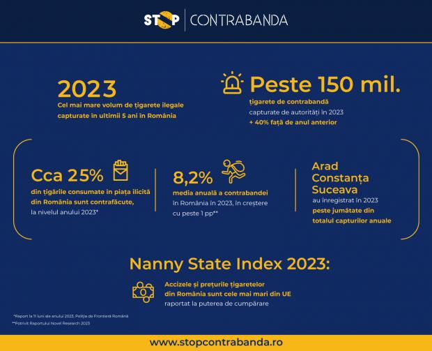 În 2023, media anuală a contrabandei cu țigarete în România se situează în media europeană din 2022, evaluată la 8,2% conform studiului KPMG. Anul trecut au avut loc 2 revizuiri succesive ale accizei la produsele din tutun și nicotină, în contextul în care accizele și prețurile țigaretelor din România sunt cele mai mari din UE raportate la puterea de cumpărare*. În țările învecinate României, țigările pot fi cumpărate chiar și la aproximativ jumătate din preț, contrabanda fiind astfel foarte profitabilă. De asemenea, România are 2.000 de km de graniță cu țări non-UE, în care prețul tutunului poate fi de până la trei ori mai mic.