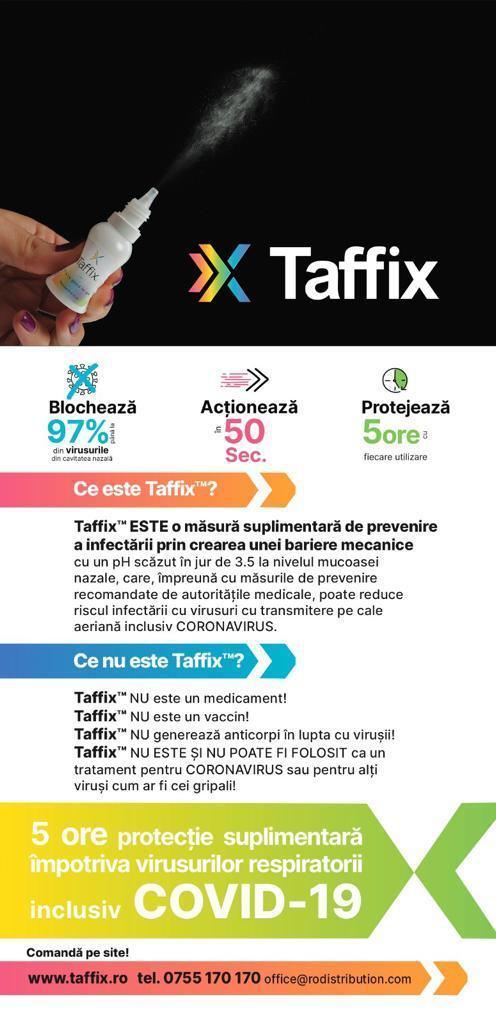 Folosit împreună cu masca, TAFFIX ne ajută decisiv să recuperăm idealul pierdut al vieții dinaintea pandemiei când ieșeam fără griji din casă. Produsul, care acționează omorând virusurile înainte să ajungă în mucoasa nazală, a fost creat de compania farmaceutică Nasus Pharma din Israel, un stat aflat în topul cercetării medicale și dovedit ca fiind cel mai eficient în combaterea actualei pandemii.