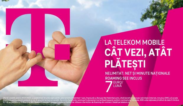 Daca ai unul dintre noile abonamente NELIMITAT, disponibile începând de la 7 euro/lună, ești liber să vorbești nelimitat în roaming și să trimiți SMS nelimitate, fără să plătești nimic în plus, și ai și trafic de internet inclus, care variază între 4,7 GB și 12 GB, în funcție de planul tarifar ales, fără costuri suplimentare pentru serviciul de roaming.