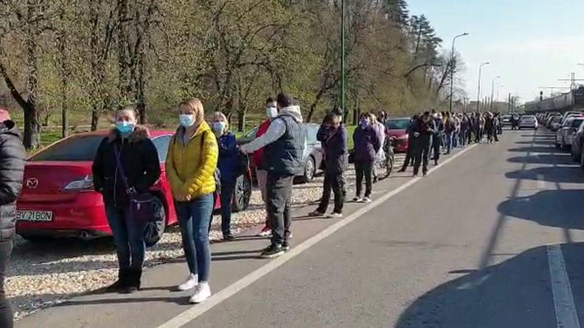 Circa 200 de oameni stau la coadă joi dimineaţă, cu masca de protecţie pe gură şi aşteaptă să se imunizeze cu serul de la Pfizer.