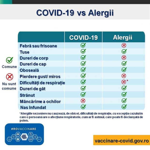 Utilizați acest grafic pentru a afla mai multe despre asemănările și diferențele dintre alergii și COVID-19. Dacă aveți simptome, discutați cu medicul dumneavoastră. Este posibil să aveți nevoie de un test COVID-19 pentru a vă confirma diagnosticul”, se arată pe pagina de Facebook RoVaccinare.