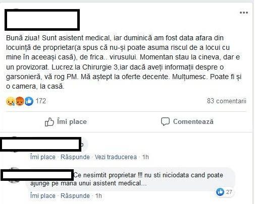 „Sunt asistent medical, iar duminică am fost dată afară din locuință de proprietar (a spus că nu-și poate asuma riscul de a locui cu mine în aceeași casă) de frica...virusului. Momentan, stau cu cineva, dar e un provizorat. Lucrez la Chirurgie 3, iar dacă aveți informații despre o garsonieră vă rog P.M. Mă aștept la oferte decente. Poate fi și o cameră la casă”, a scris asistenta.