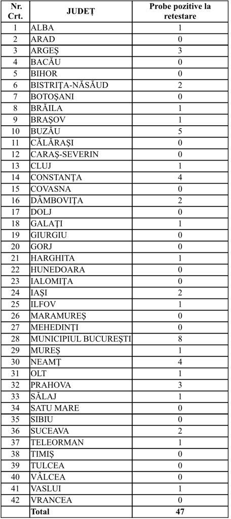 Distinct de cazurile nou confirmate, în urma retestării pacienților care erau deja pozitivi, 47 de persoane au fost reconfirmate pozitiv. Distribuția pe județe a acestor cazuri o regăsiți în tabelul de mai jos.