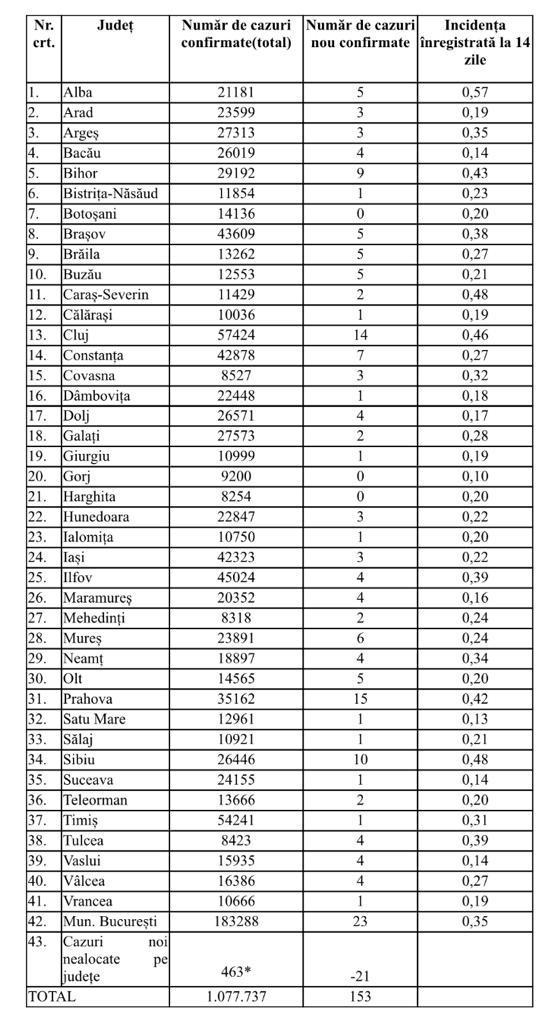 *Referitor la „cazurile noi nealocate pe județe”, facem precizarea că numărul acestora este determinat de modificările aduse platformei electronice prin care sunt raportate și centralizate rezultatele testelor pentru noul coronavirus. Astfel, conform noii metodologii, centrele de testare introduc în mod direct rezultatele testelor realizate, urmând ca de la nivelul Direcțiilor de Sănătate Publică să fie realizată ancheta epidemiologică și atribuite cazurile pozitive județului/localității de care aparțin persoanele infectate.