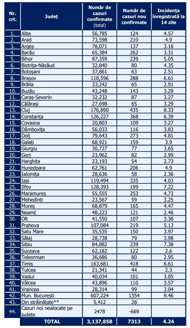 În ultimele 24 de ore au fost înregistrate 7.313 cazuri noi de persoane infectate cu SARS – CoV – 2 (COVID – 19), cu 2.551 mai puține față de ziua anterioară. 1.441 din cazurile noi din 24 de ore sunt ale unor pacienți reinfectați, testați pozitiv la o perioadă mai mare de 90 de zile după prima infectare.
