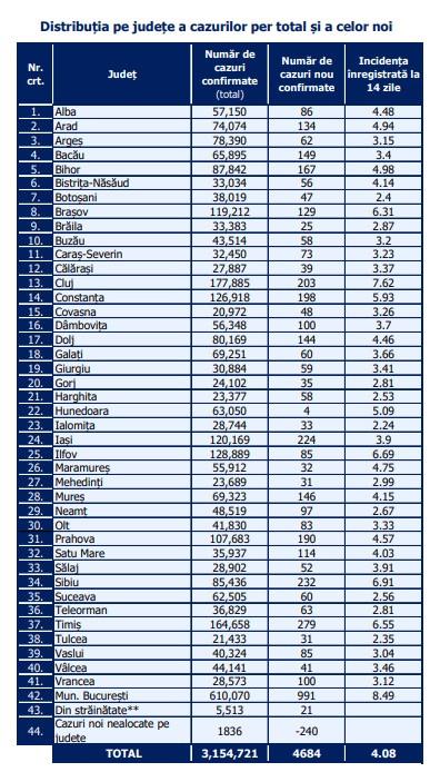 În ultimele 24 de ore au fost înregistrate 4.684 cazuri noi de persoane infectate cu SARS – CoV – 2, cu 1026 mai puține față de ziua anterioară. 890 din cazurile noi din 24 de ore sunt ale unor pacienți reinfectați, testați pozitiv la o perioadă mai mare de 90 de zile după prima infectare.