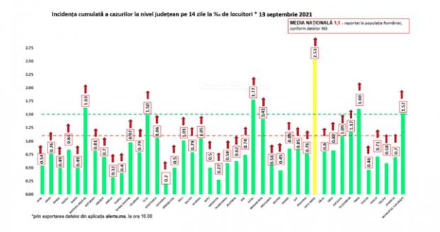 Bilanț COVID-19 din 13 septembrie 2021, în România. Rată incidență pe județe