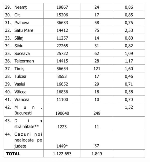 În urma testelor efectuate la nivel național, față de ultima raportare, au fost înregistrate 1.849 de cazuri noi de persoane infectate cu SARS – CoV – 2 (COVID – 19), acestea fiind cazuri care nu au mai avut anterior un test pozitiv.