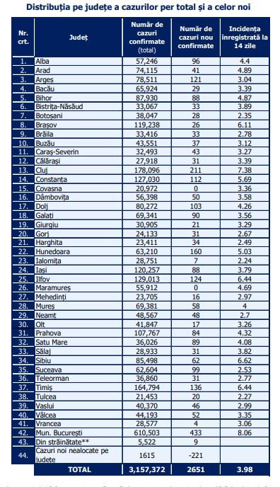 În ultimele 24 de ore au fost înregistrate 2.651 cazuri noi de persoane infectate cu SARS – CoV – 2 (COVID – 19), cu 2.033 mai puține față de ziua anterioară.