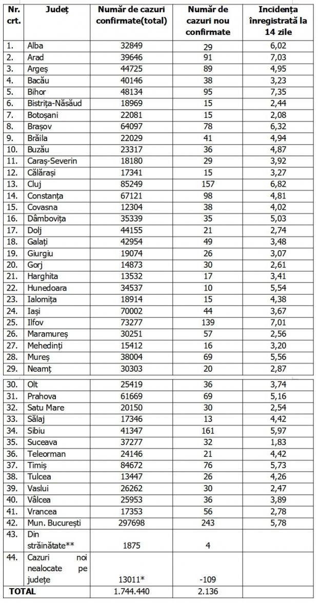 În ultimele 24 de ore au fost înregistrate 2.136 de cazuri noi de persoane infectate cu SARS – CoV – 2 (COVID – 19), dintre care 37 sunt ale unor pacienți reinfectați, testați pozitiv la o perioadă mai mare de 180 de zile după prima infectare.