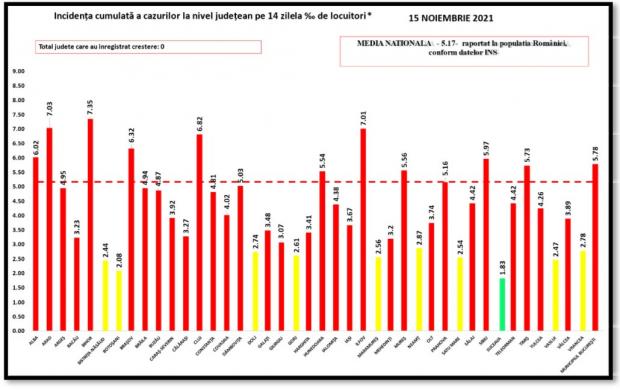 În intervalul 14.11.2021 (10:00) – 15.11.2021 (10:00) au fost raportate de către INSP 195 de decese (92 bărbați și 103 femei), din care 16 anterioare intervalului de referință, ale unor pacienți infectați cu noul coronavirus, internați în spitalele din Alba, Arad, Bacău, Bihor, Bistrița-Năsăud, Botoșani, Brașov, Călărași, Caraș-Severin, Cluj, Constanța, Dolj, Galați, Giurgiu, Gorj, Harghita, Ialomița, Iași, Ilfov, Mehedinți, Mureș, Neamț, Olt, Prahova, Sălaj, Satu Mare, Sibiu, Timiș, Vaslui, Vrancea și Municipiul București.