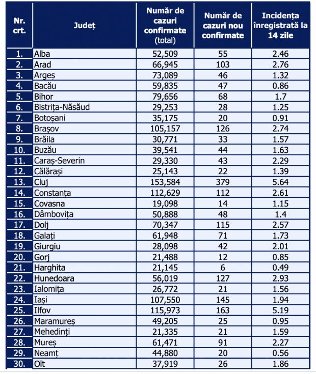 Bilanț COVID-19 din 17 martie 2022, în România. Distribuția pe județe