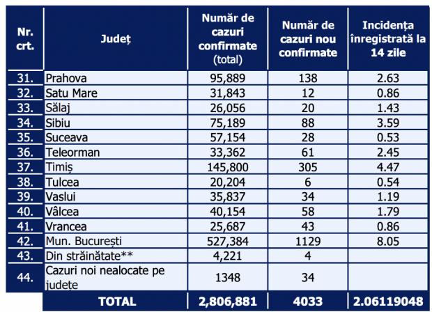 Potrivit raporrtului de joi, în ultimele 24 de ore au fost înregistrate 4.033 cazuri noi de persoane infectate cu SARS – CoV – 2, cu 120 mai multe decât în ziua anterioară. 506 dintre cazurile noi din 24 de ore sunt ale unor pacienți reinfectați, testați pozitiv la o perioadă mai mare de 90 de zile după prima infectare.