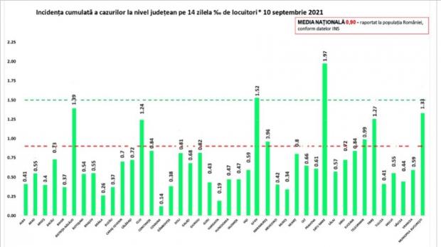 Coeficientul infectărilor cumulate la 14 zile, raportate la 1.000 de locuitori este calculat de către Direcțiile de Sănătate Publică, la nivelul Municipiului București și al județelor. Mai jos aveți graficul realizat în baza raportărilor primite de CNCCI de la Direcțiile de Sănătate Publică: