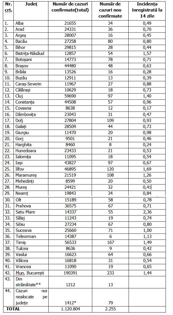 În urma testelor efectuate la nivel național, față de ultima raportare, au fost înregistrate 2.255 de cazuri noi de persoane infectate cu SARS – CoV – 2 (COVID – 19), acestea fiind cazuri care nu au mai avut anterior un test pozitiv. Distribuția pe județe a cazurilor per total și a celor noi o regăsiți în tabelul de mai jos.